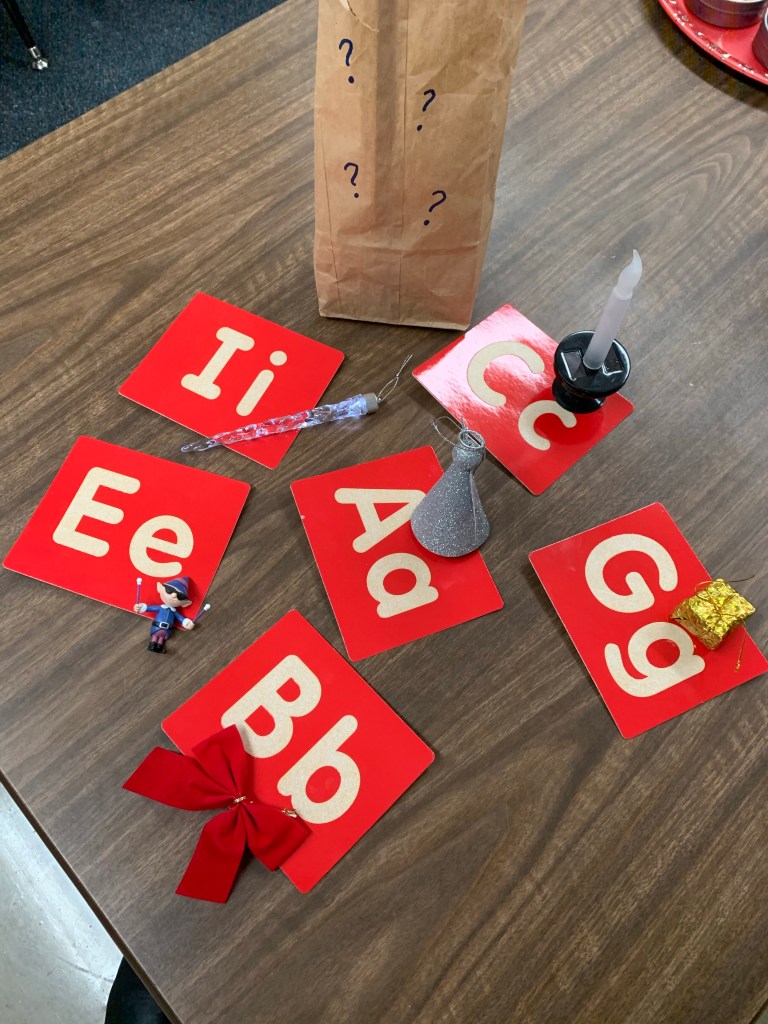 When there’s a week that we are not introducing a new letter, we review letters we have already learned. I try to base the items around the monthly theme. In December, all the items in our bag were Christmasy! I laid out the letter cards in the middle of their circle and we had to match the item to the correct letter. We made it a game that we had to work together to solve. One week in February, I put in pink, red, and purple magnetic letters to review.