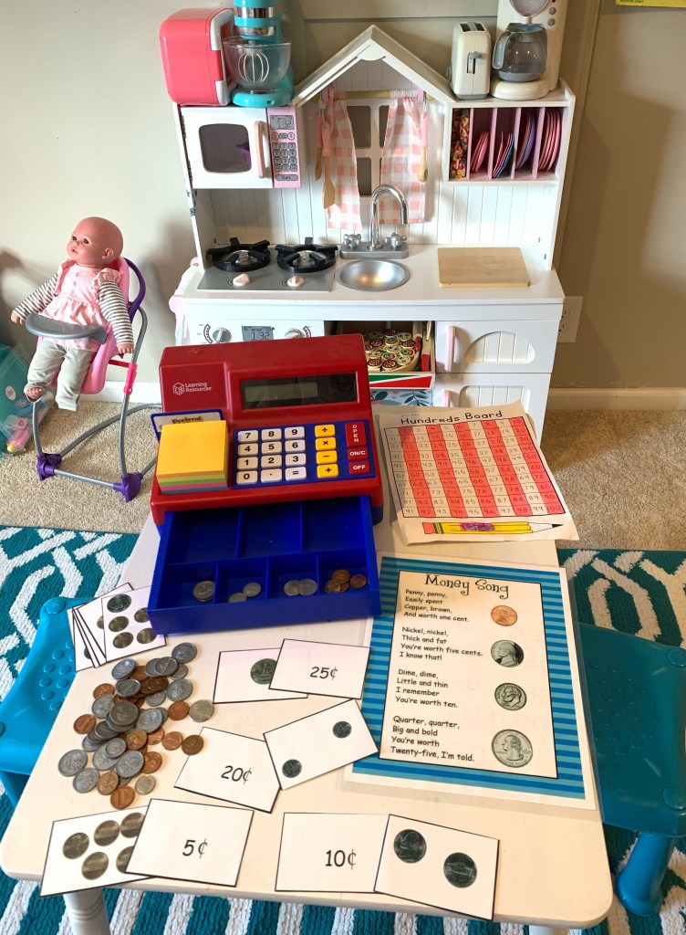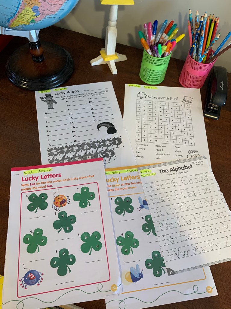 Reading comprehension– I use Bob Books at home and she came home with some high frequency word books sent from school. After she reads one, she’ll roll a die and that will tell her how she’ll respond to the story.. I’m not doing the writing portion, just using it as a discussion template. This makes it a game, and I guarantee she’ll want to do more than one.. because that’s just her.Writing practice– T loves to write and create books. Her teacher sent home the blank pink booklets so we will definitely be utilizing those. The others are prompts with St. Patrick’s Day coming up and birthday cards to create. Vocabulary/Word work ideas. Word searches and word scrambles are amazing brain development tools and help improve mental acuity. Some of these are from workbooks I had, but Google is your friend. Soo many free activities out there!! (After she rainbow traces the alphabet, she can see how many words she can make.)Sight words– I’m going to use this Bananagram game for us to play using her sight words. She will have her flash cards as a reference! Counting coins and skip counting– I’m going to encourage her to play “grocery store”. She can price items in her kitchen set and “ring” them up.. or create some sort of menu with prices. She has Post-it notes to write on and coins to sort/count. She jump-started “home school” today bc she was soo excited and wanted to color the skip counting chart by 2s. I plan to print more for her to color by 5s and 10s. She can then use these charts to help her count her nickels and dimes. Some of the coins are fake and some are real.