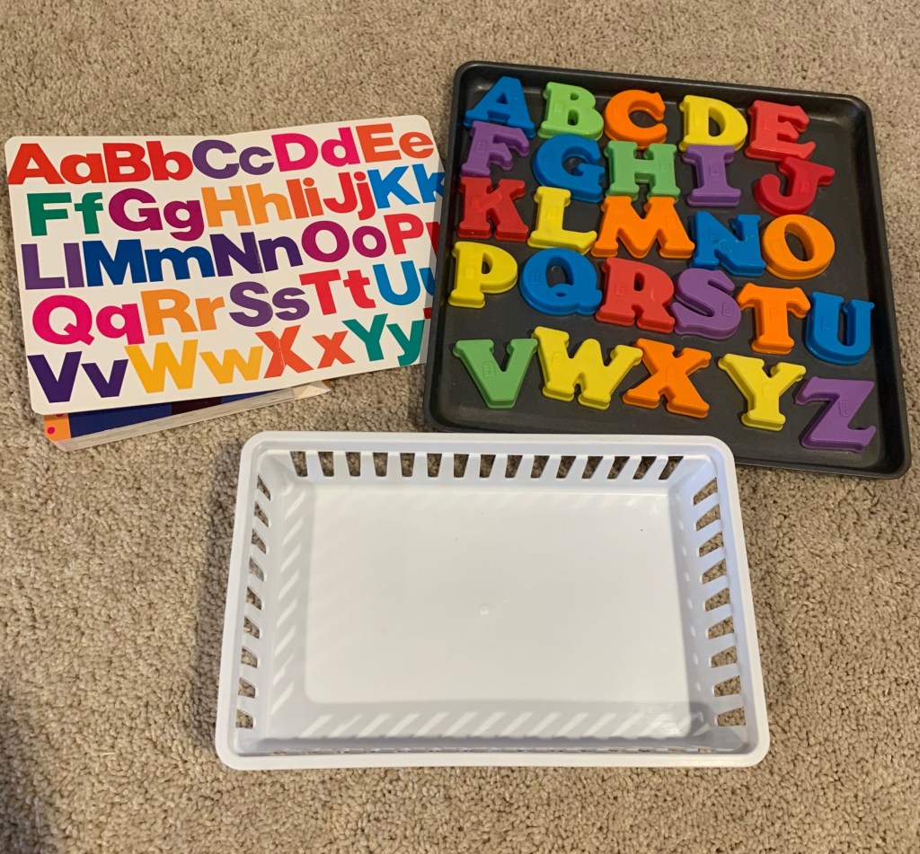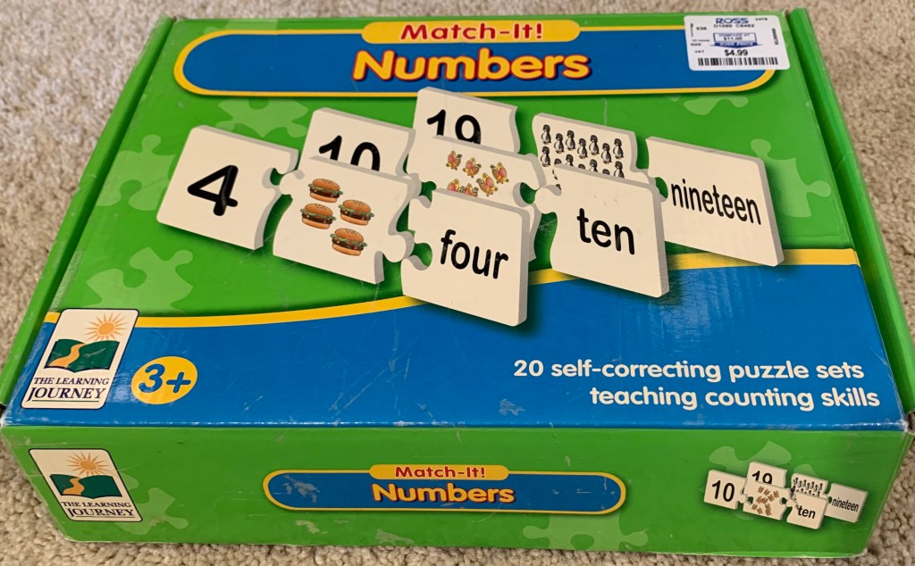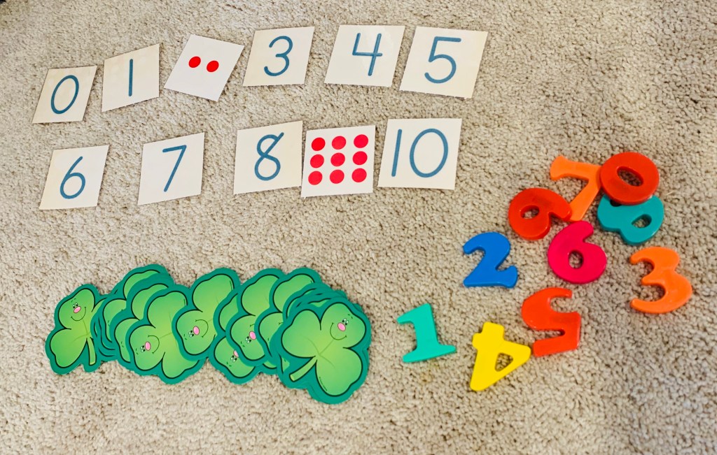 Encouraging writing– I have a bin of stickers, stencils, markers, pencils, and crayons for her to create really anything she wants on construction or computer paper. (Teaghan can obviously use these too during her writing)Putting magnetic ABCs in order. If you have magnetic letters, put them in a basket and grab a cookie sheet. It’s always a plus if they can self-check.. so I put Chicka Chicka Boom Boom out since the alphabet is in the back. Sing the ABC song to help too!Writing practice: Dry Erase markers. I own a little laminator so these sheets can be reusable. If you don’t, they sell slots at the dollar store pictured above with the “W” practice sheet inside.. you can slip any paper in and use it again and again.Counting and number recognition– These are pre-made, but you can easily make them. They have self-check on them too, flip over the card and have your child count the dots to see if they were right with the number identified! I plan to use those shamrock shapes and hide them around the playroom for Rowan to find. I’ll help her line them up once she finds them all and practice counting (there’s 20 total). She can rote count to 30 but skips 15 so we will be working on that with one-to-one counting. Magnetic numbers can be used as well to put in order. The Number Wheel as mentioned before in my blog is also a really great tool!! Rowan LOVES these Poke-a-Dot books!! They are great tools for counting and fine motor, they make a popping noise when each button is pushed! I’ll have this puzzle for her to work on as well. It’s also a great tool for self-check since the number and picture will only fit together if correct. I took the number words out of the box since she’s not ready.. but that’s where Teaghan can chime in and finish the puzzle!