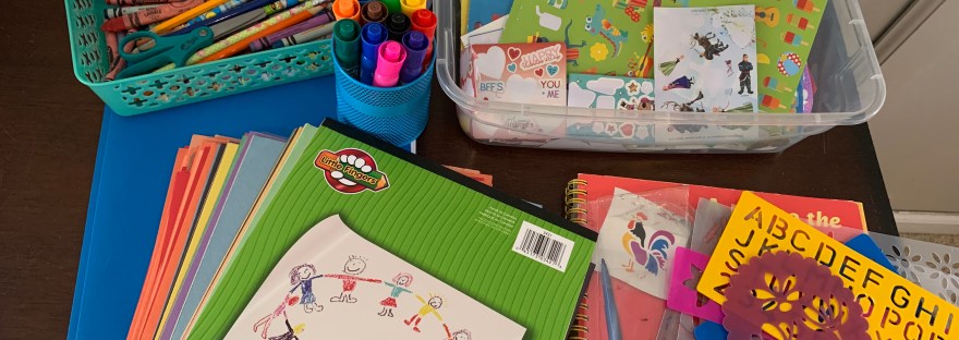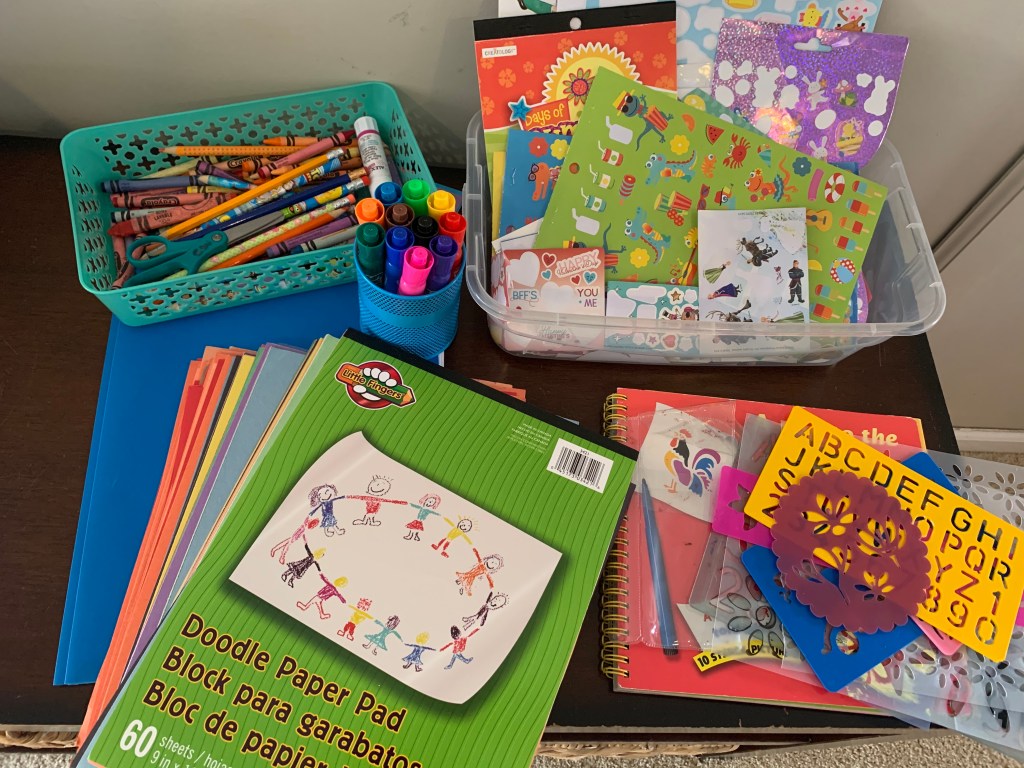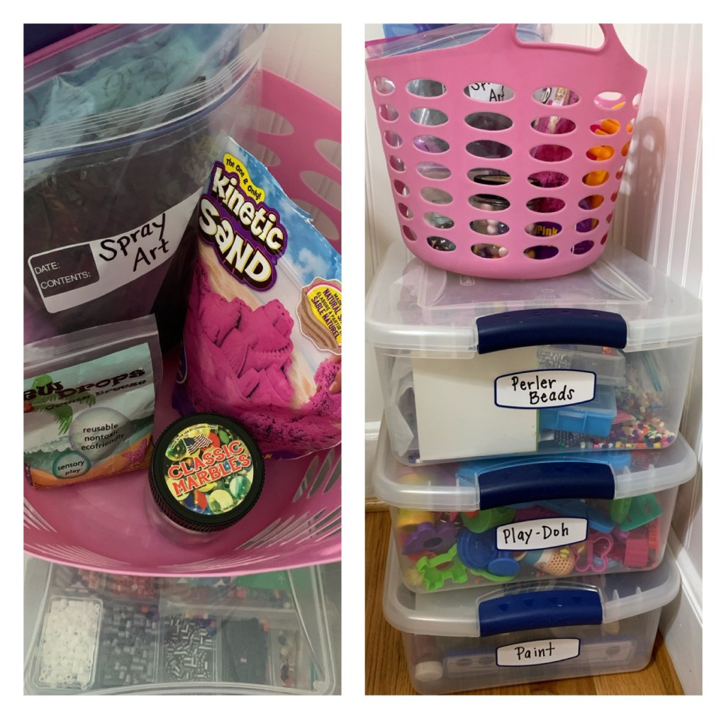 We have a whole closet full of arts and crafts stuff. I pulled a few containers out for them to easily chose from independently and take outside or to the table so they aren’t constantlyyy needing my help.