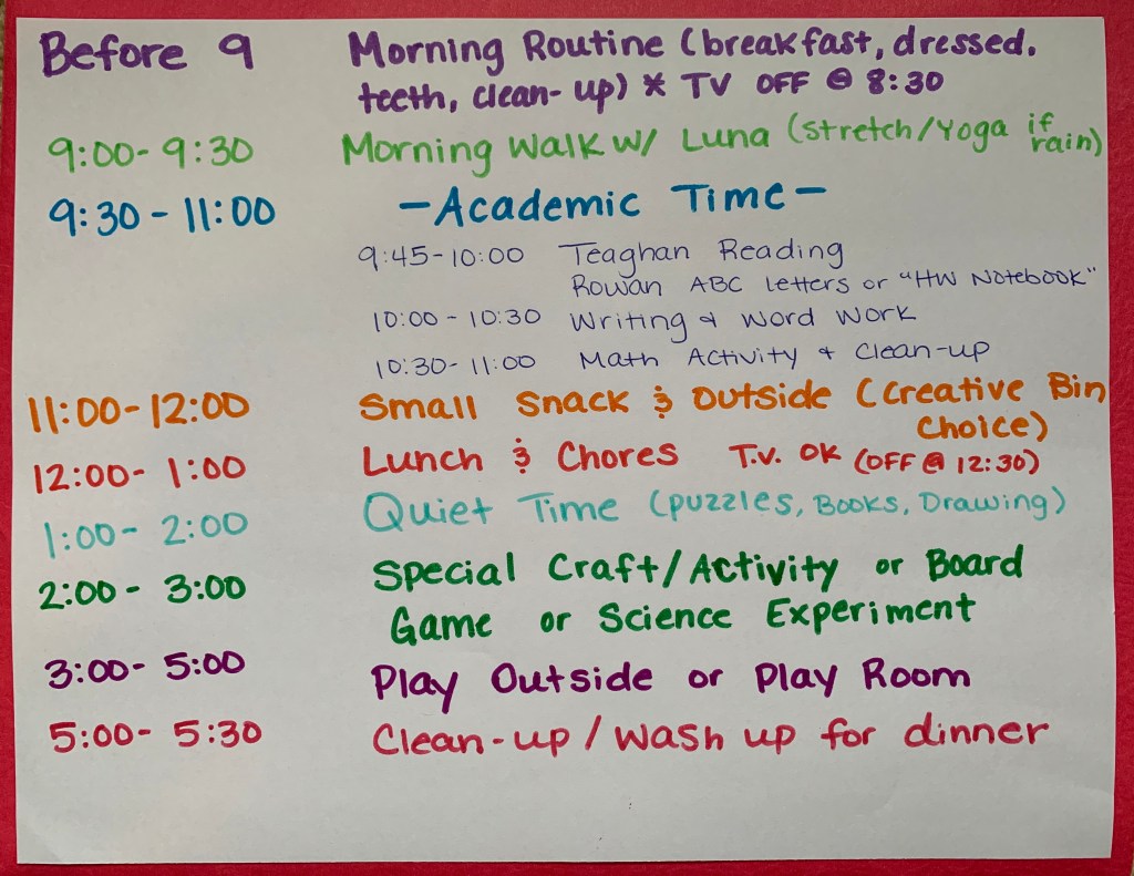 I told my girls yesterday school would be closed for several weeks but we would most definitely be doing some sort of “homeschool”. This morning, I had a chair and little area set up for me when I came downstairs to start teaching😭. Children love structure. However..I quickly told them momma’s not workin’ weekends and to go play.😅 I spent the majority of my morning organizing for the next two weeks. Would part of me like to stay in jammies and have a free-for-all? Yes. However, I’d give it two days (and that’s being generous) and they’d be ready to kill each other. Let’s be honest here. Also, having absolutely no structure would just set them up for failure when returning to school. I put together a little schedule for us to follow. They will not have a completely structured day and I will not be entertaining them all day. Children need to be bored from time to time, it’s when their creativity sparks. If it’s nice out… they are going outside. Dig in dirt, jump on the trampoline, blow bubbles, make an obstacle course, arts and crafts.. I don’t care, but go outside. If it rains, they can choose from our creative play bin for inside on the table or go play in the playroom. My kids don’t use the iPad at home, that’s just my personal decision. I haven’t decided yet if Teaghan will use it a little for her programs she uses at school. I’m not a fan, but I don’t want her to fall behind in the programs. At max she’ll do 20 min a day, or maybe just rainy days? Idk. 🤷🏻♀️
