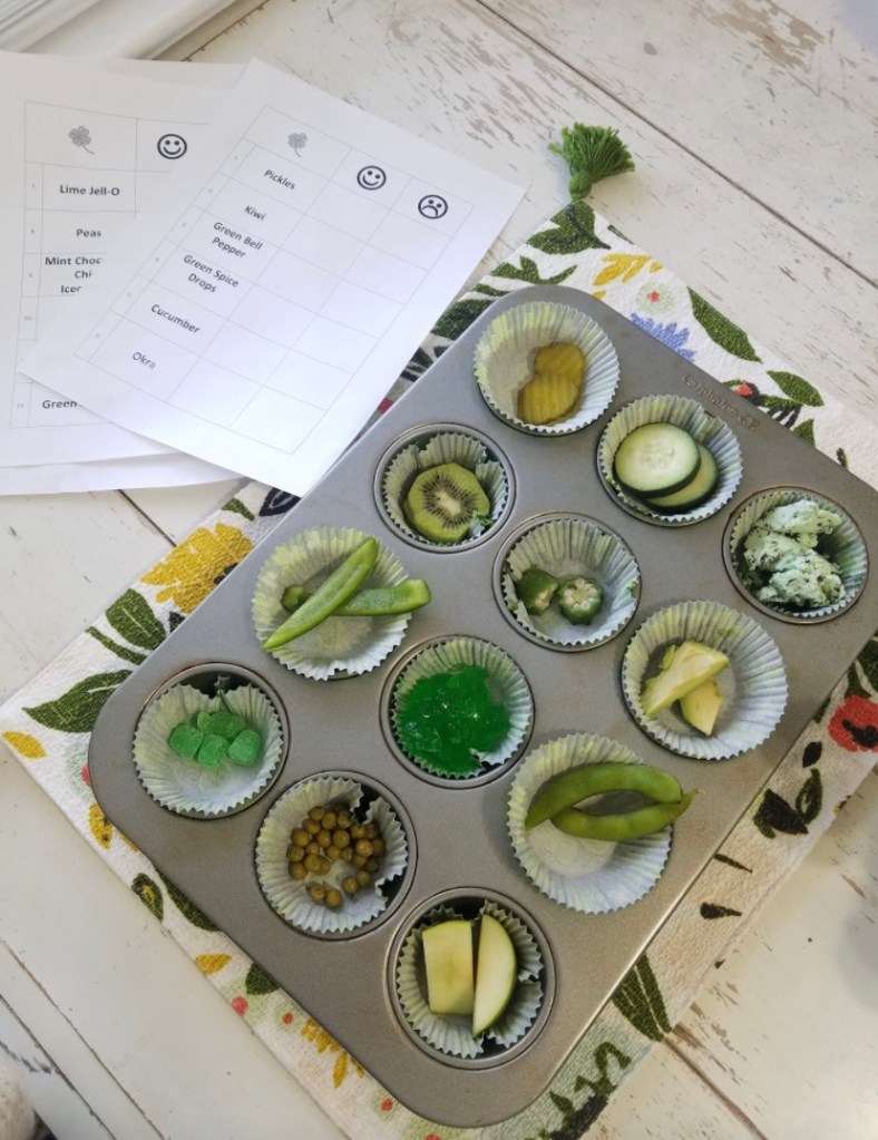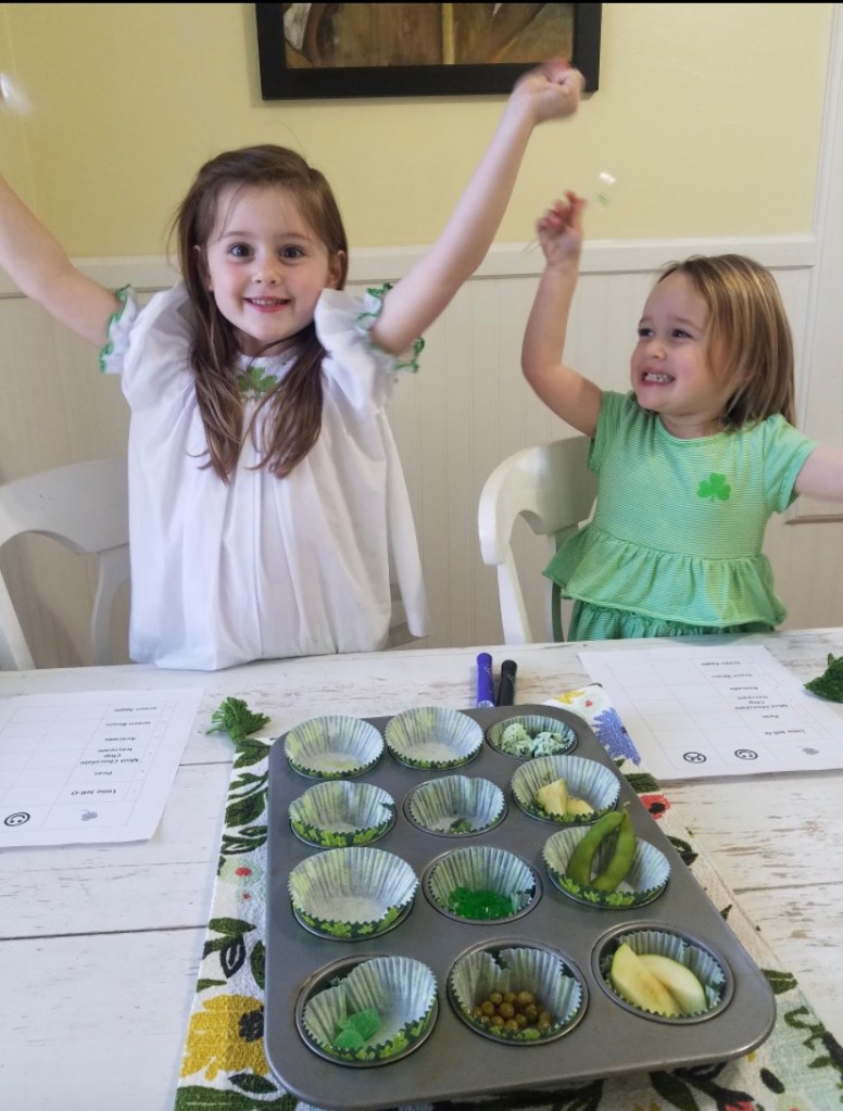 Taste test! This was a HUGE hit last year with my girls and I was soo excited to try with my preschoolers this year. Womp. I gathered up a bunch of green foods.. this year won’t be as much because I’m definitely not going out to get certain items just for this (under the circumstances). It was unbelievable what they would actually try, just from how I presented it.. in cupcake liners, in a muffin tin! We graphed and voted our answers. We counted and talked about textures. We talked sour vs. sweet, veggies vs. fruit, healthy vs. not-so-much. Make everything a learning experience for your child. They seriously loved eating every single one.. okay maybe not the okra. BUT they’ve been asking to do this again since last year!