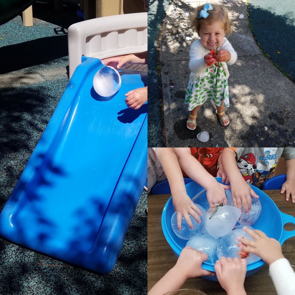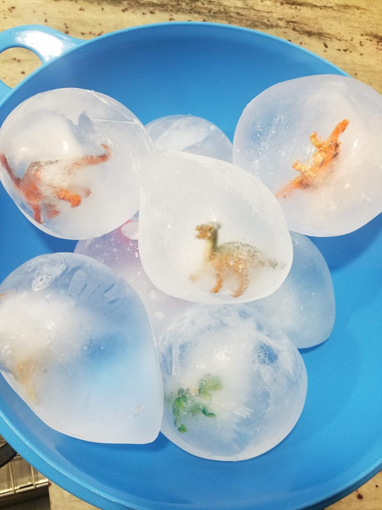 This requires just a tad bit of prep work.. but it’s not very time consuming. I have taken little plastic Dinos and placed them inside a balloon, then filled it up with water. (You can fill them to make them as big or small as you want.) Tie the knot and freeze them! Cut and peel the balloon off once frozen. Put in a bucket outside and let your child explore! I used dinosaurs to make “Dino eggs” but I will probably use Rowan’s little Hatchimal things this go around. They get SO excited when the creature finally “hatches”! Talk about ice and temperatures, how it feels, how ice melts into water, opposites, etc.Learning through P L A Y 🧊 💦
