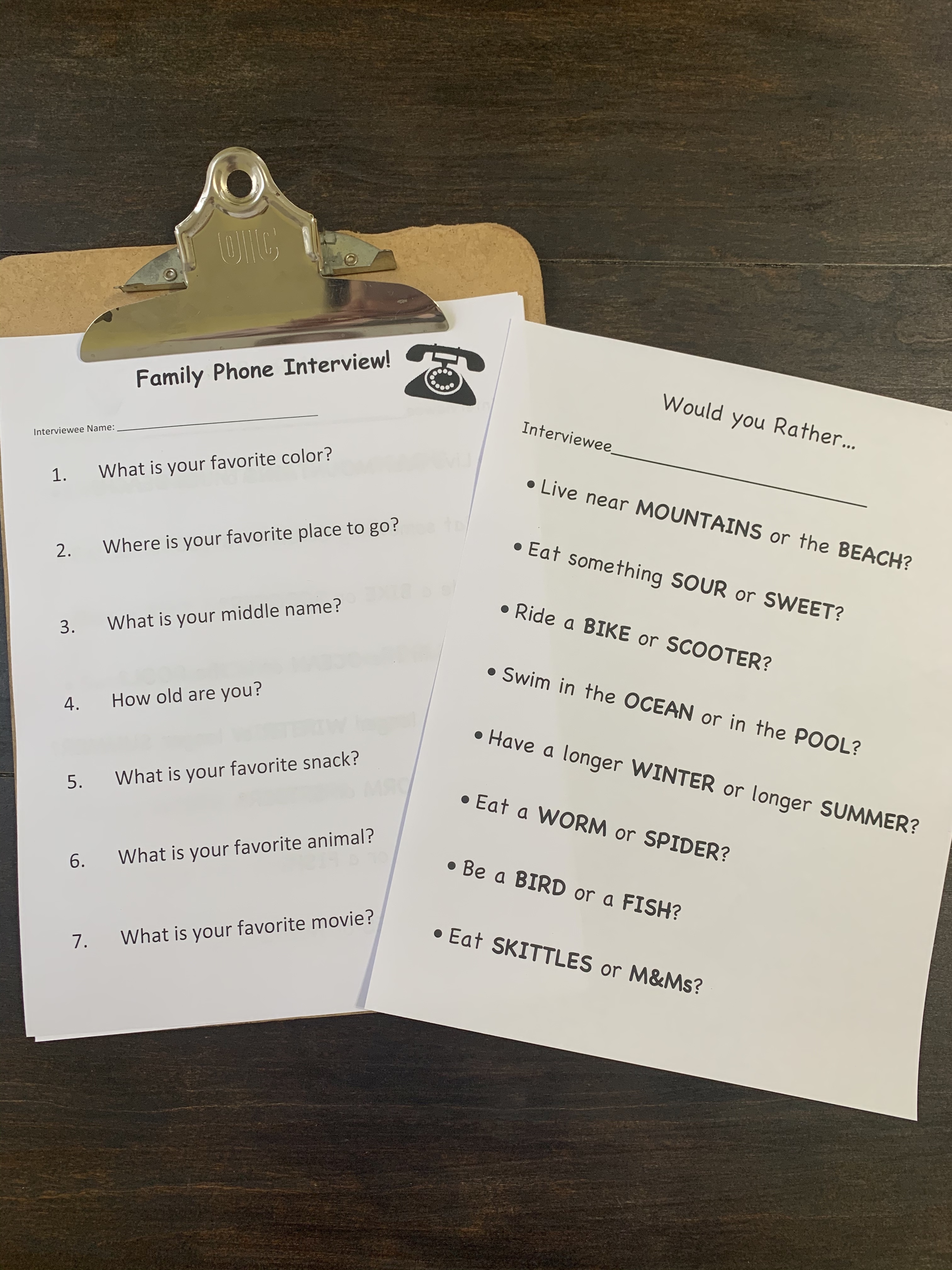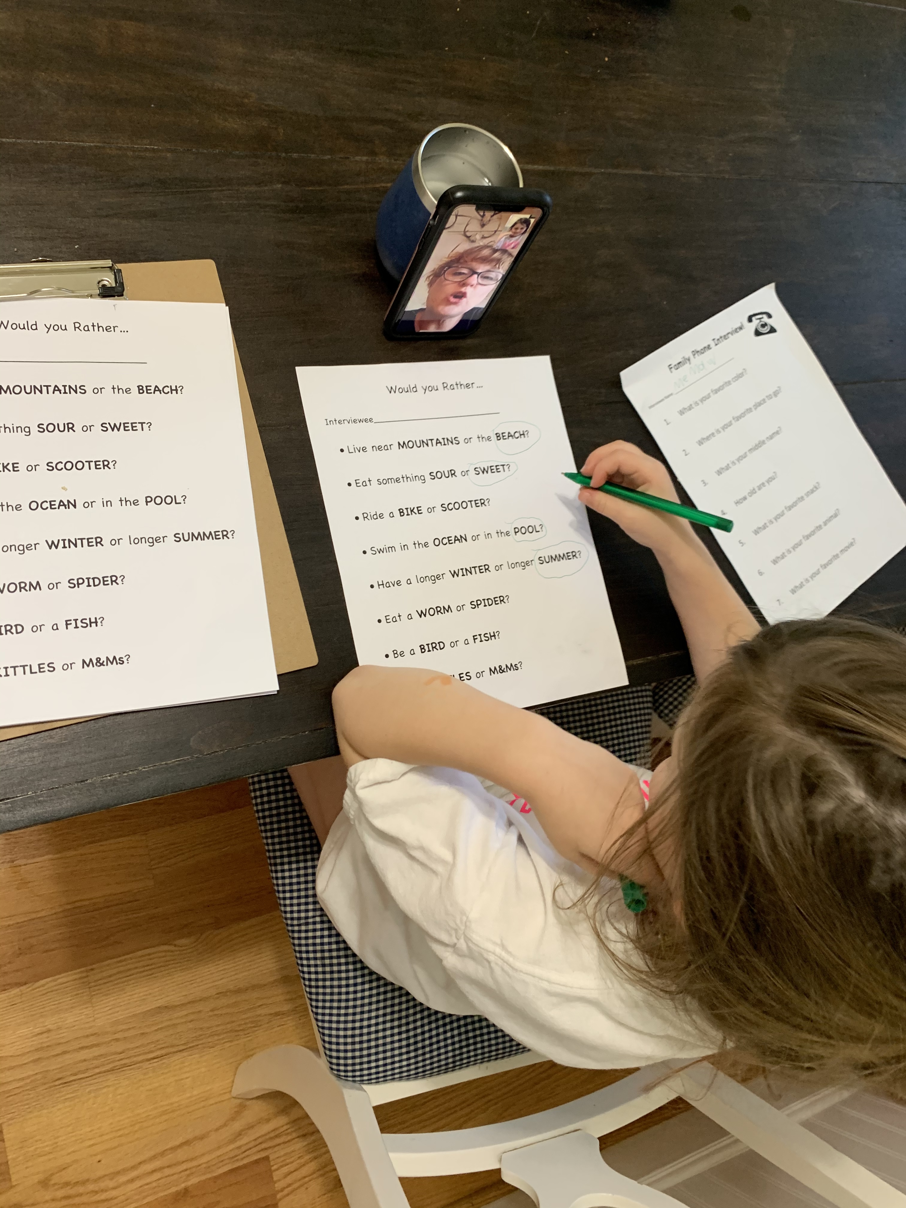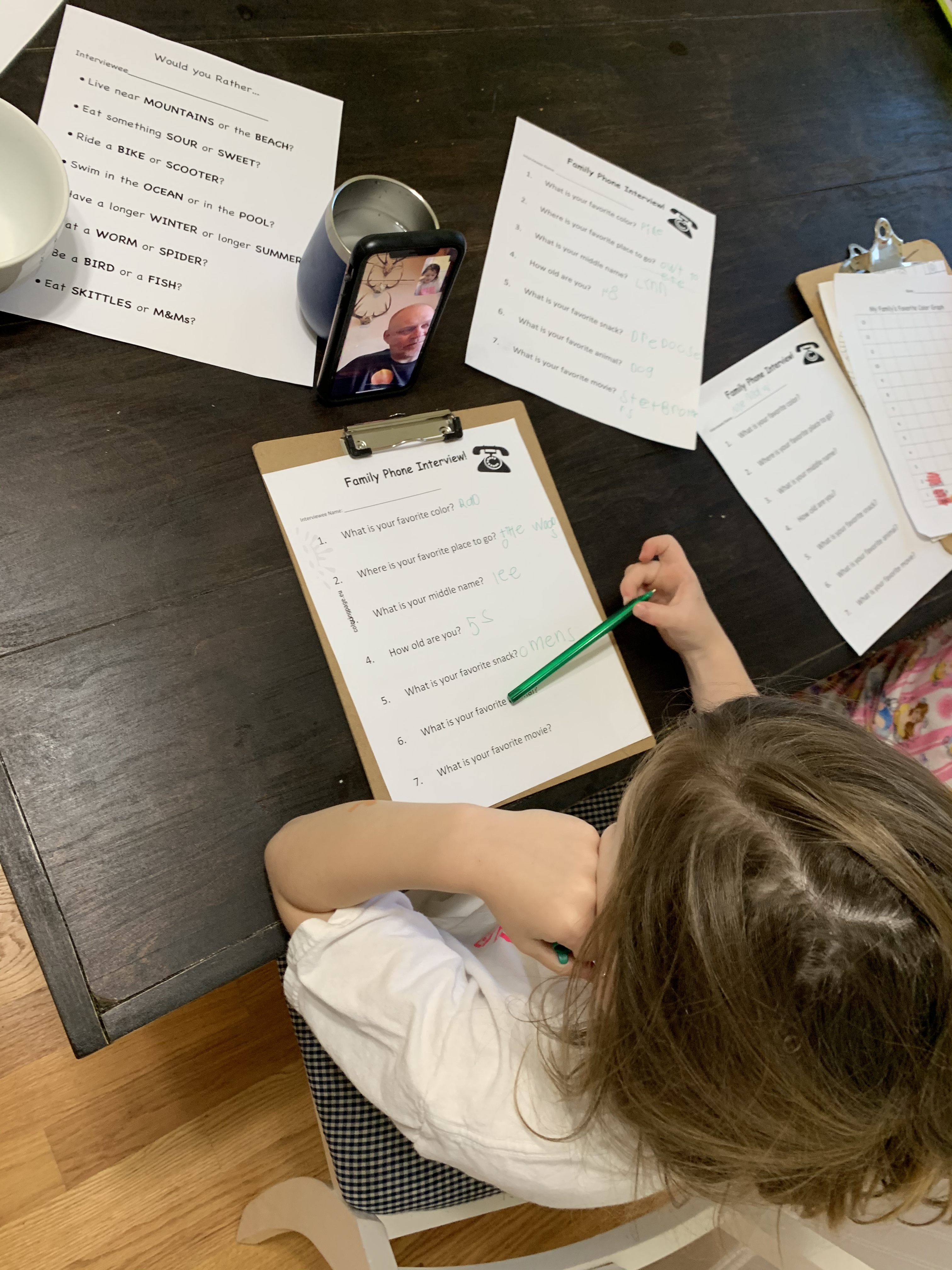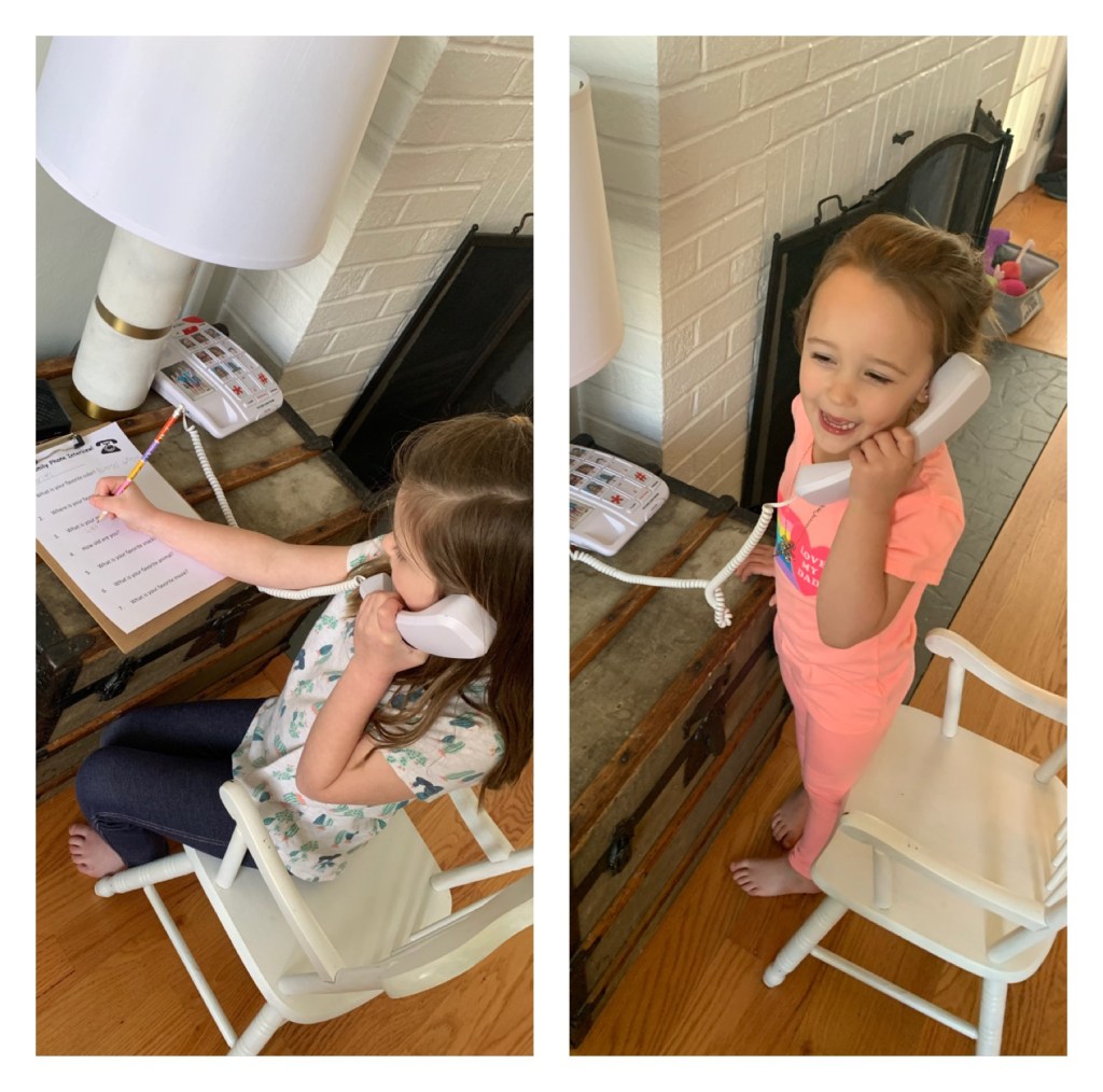My biggest obstacle with this whole “homeschool” thing (so far) is finding activities that I can differentiate for both girls. Because they are SOO curious what the other is doing and want to do it too! We are trying to make the most of this social distancing as we can. Why not make it an opportunity to learn more about family members? Teaghan helped me come up with the questions for her very own Family Interviews. Rowan is working on interviewing favorite colors and making a graph to see which color “wins”. ❤️🧡💛💚💙💜They have both really enjoyed conducting these! Whether it’s via FaceTime or our house phone (I think it’s an elderly phone😅 off Amazon- it’s for our girls for emergencies, which I highly recommend! They press “photocall” and that person’s photo and it automatically dials.) They sit with their little clipboards and pens and it’s the cutest thing ever. “I wonder what their favorite snack is? Mine are fruit strips and gummies, maybe they like them too!” They love learning about their loved ones and comparing all the answers.