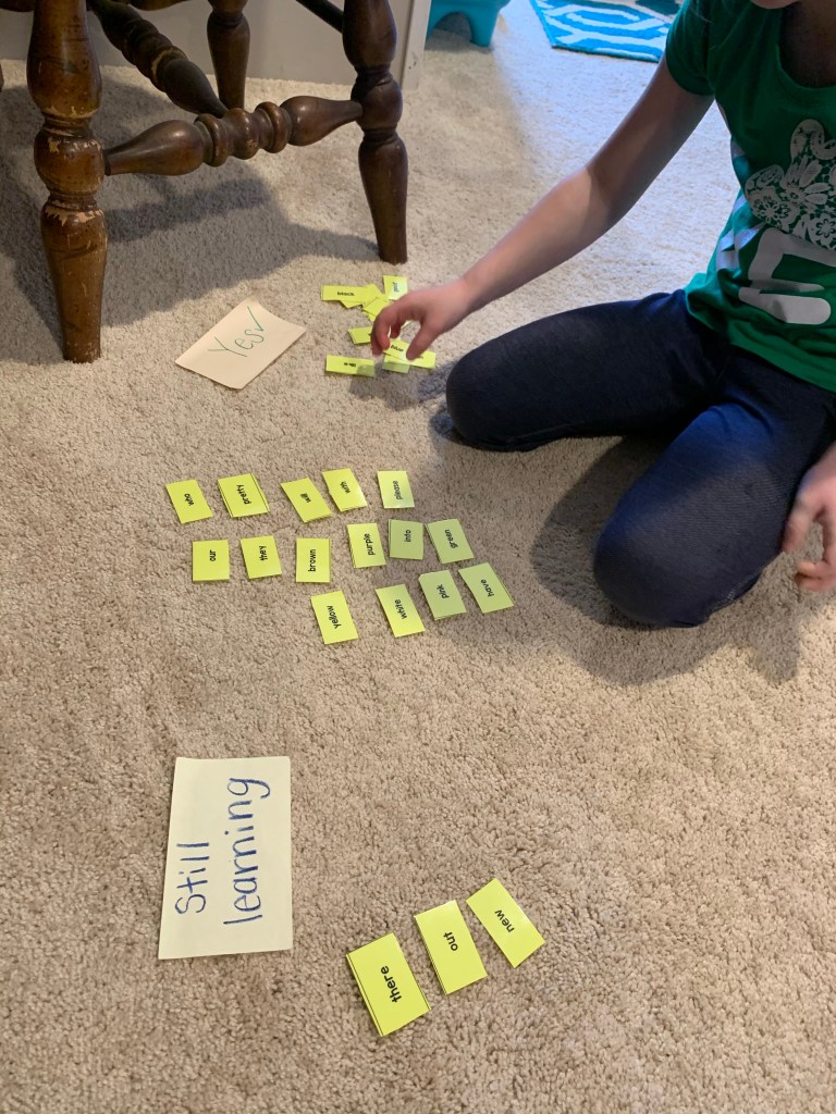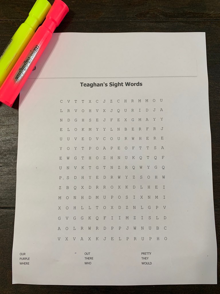 Teaghan loves a word search and there’s still some sight words that she is not getting as fast as the others.. or I’m seeing her confuse with other words while reading (example occasionally saying “three” for “there”). So, I decided to make her her very own word search using them! I used Discovery Education. Very simple to use. Plug in the words you want in the word search and it generates it for you! Also.. something about using a highlighter is just so “cool” per Teaghan. 🤣😅Last week I “pretested” her to see where we needed to focus. We put her sight words in a pile and she sorted them as she attempted each one! It creates her own personal goal to get all the words in the “yes!” pile. She self-corrected a few that are in the “still learning” pile, but together, we decided they should be focused on a little more. With sight words, the child should be calling them out fast when drilling with flash cards. Then, they should start to make connections when they see the same words in a text while reading.