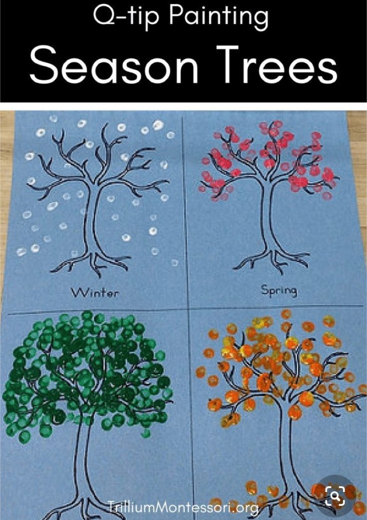 Social Studies week 3 and Science week 1: Seasons 🌳 🌼🍁❄️ These two should be integrated in my opinion. Brainpopjr.com has some good videos on Seasons that we will utilize. There’s a daily writing prompt that can be doubled up as one of the Social Studies assignments “my favorite season is…” There’s also two assignments we can get a two-for-one deal on… the tree picture. Teaghan is going to Q-Tip paint the trees for each season to make it a little more exciting. (See example below per Pinterest) For the winter vs. summer bear 🐻 drawing, we will make a big cardboard box into a hibernating cave. They threw a random day of Transportation in Social studies, but you can talk about the jet mentioned in The Big Trip and turn that same oversized cardboard box into some sort of vehicle. 🚗 ✌🏼😎