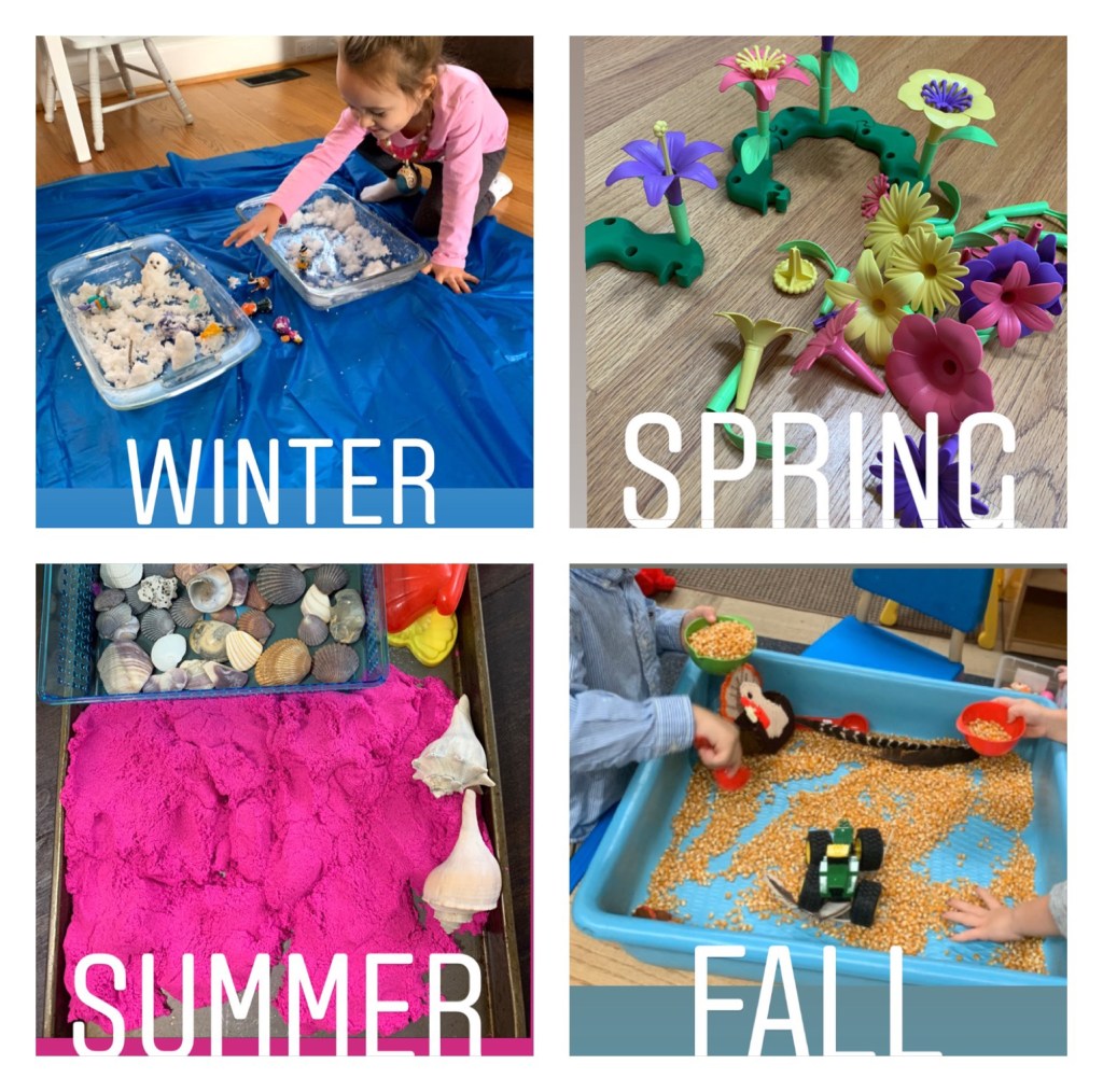 Winter– see my previous post about how to make Snow! ❄️ Spring– build your own flower garden 🌸 Summer– Kinetic sand, 🐚s and a few sand toys! Fall– popcorn kernels, spoons, bowls and 🚜s!