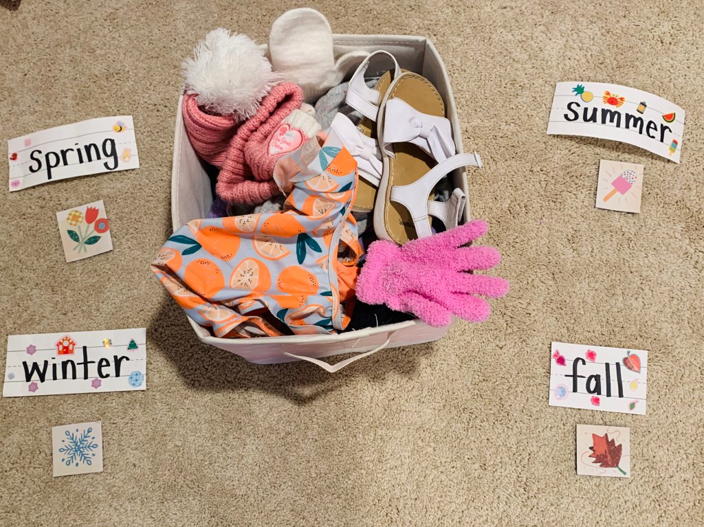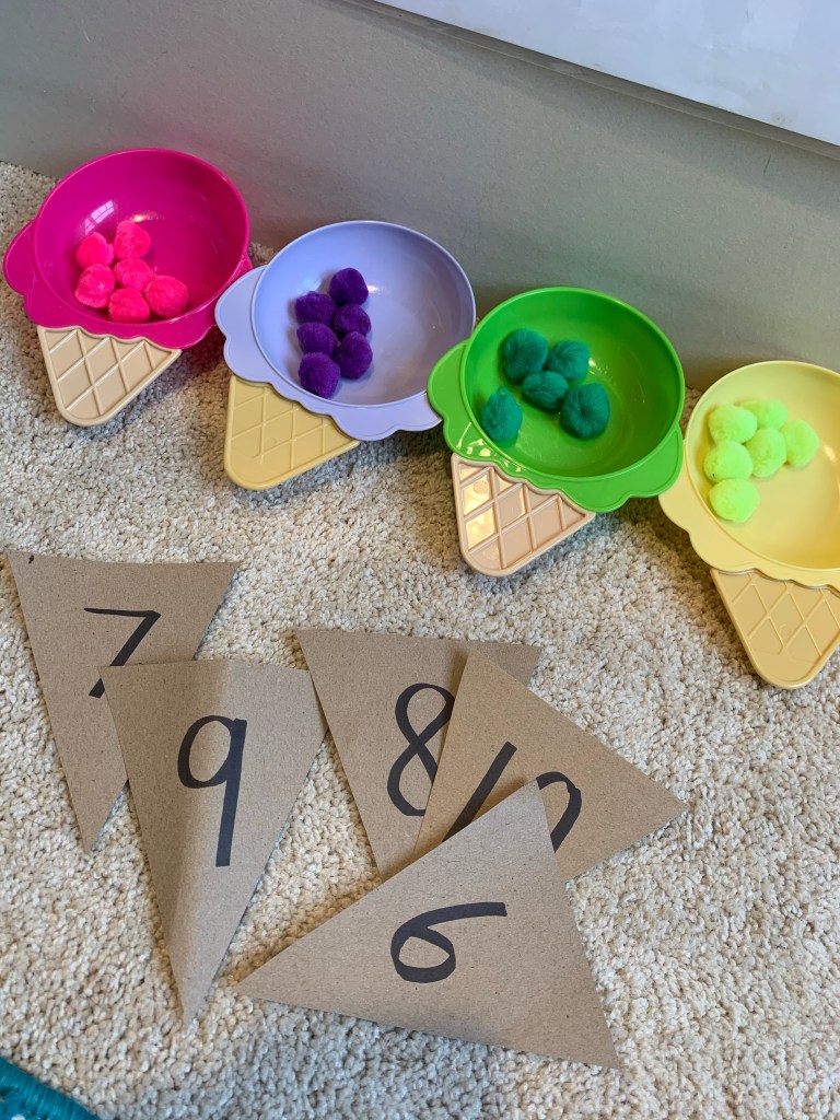 I’ve stated before, my biggest obstacle doing this “homeschool” thing is both girls want to be doing the other’s activity. Want what you can’t have. FOMO. Idk but I am trying to set myself up for success here so I thought of some activities Rowan can be doing based kinda around Teaghan’s work. Ice cream counting with Pom poms and sorting in bowls, playing with her ice cream truck, sorting a pile of her clothes into different seasons and putting on a fashion show (this should entertain her for awhile)! 👗🧥🧤👙