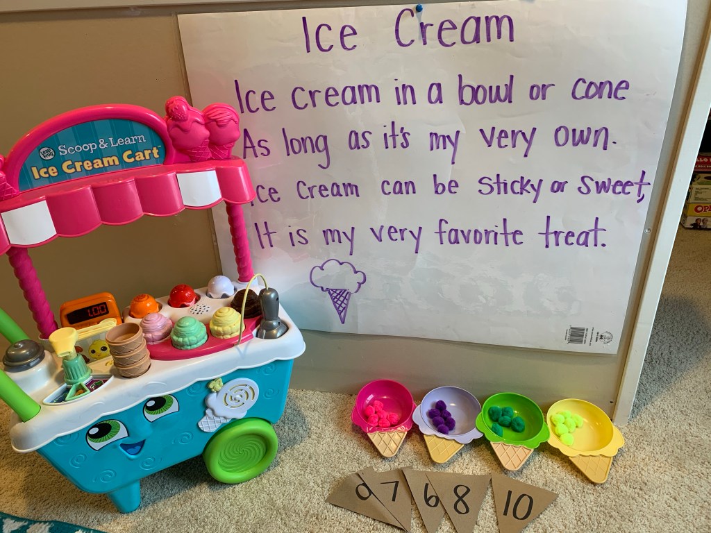Reading: Ice Cream Poem I wrote the poem on the back of a big laminated poster I had.. to act as a white board. She can point with a princess wand or pointer as we read it and she can circle rhyming words with dry erase marker. We will read a recipe on how to make homemade ice cream and make it. I recommend Mo Willem’s book, Should I Share my Ice Cream? for reading. If you don’t own it.. there are some Read Aloud videos of it on YouTube. There’s also a writing prompt of favorite treat. We’ll do that one this week, too.