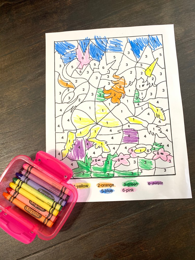 U is for Unicorn! Does your little one love to color as much as mine?! There’s these fun color-by-number pages that are great for both my girls. Thanks Google. Activities like this continue to expose Rowan to number identification. And continue to expose Teaghan to the color words. There’s all kinds of difficulty levels available online. These also help hand-eye coordination and dexterity! I simply Googled “unicorn color by number”. If your child is working on addition, subtraction, multiplication..I saw some with those too! Make anything you can more engaging and fun! This particular sheet can be found HERE!