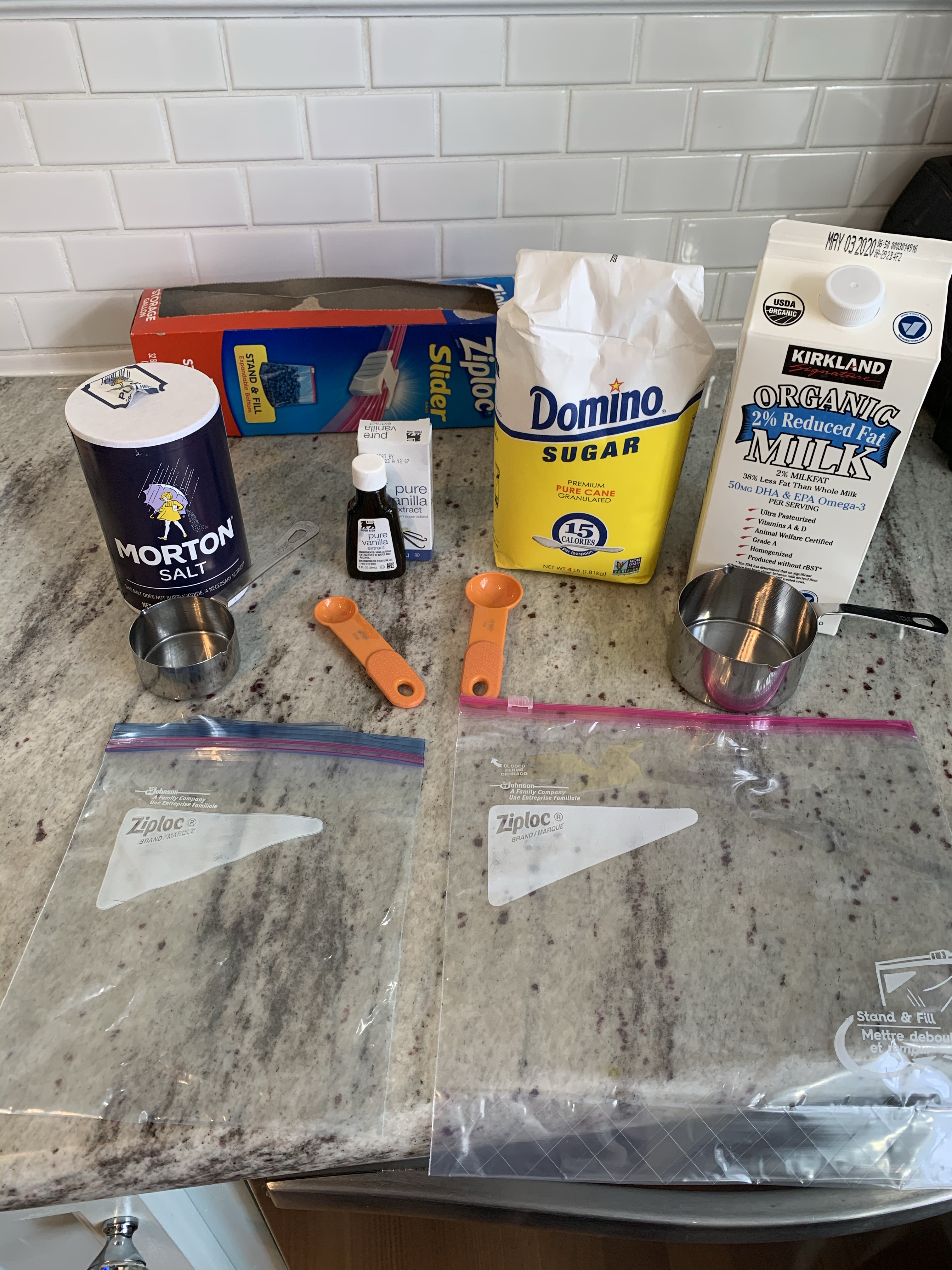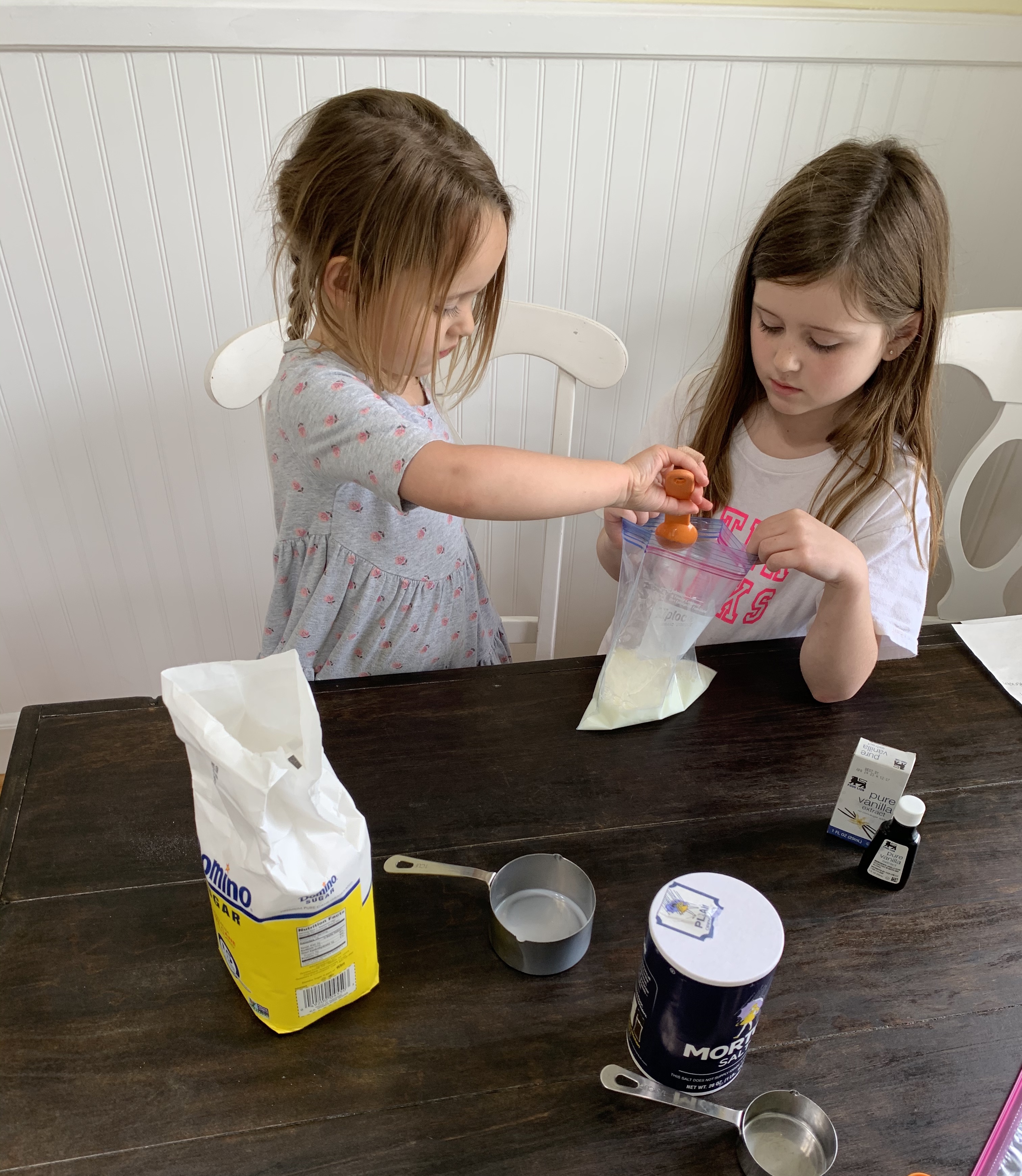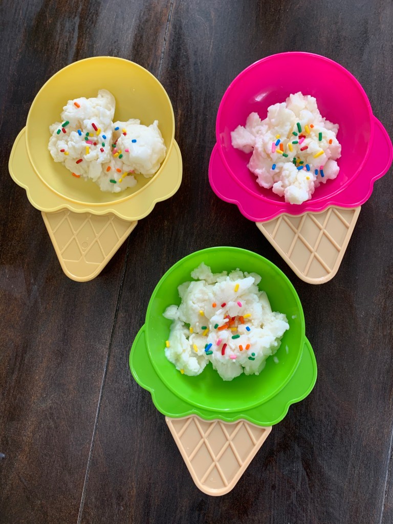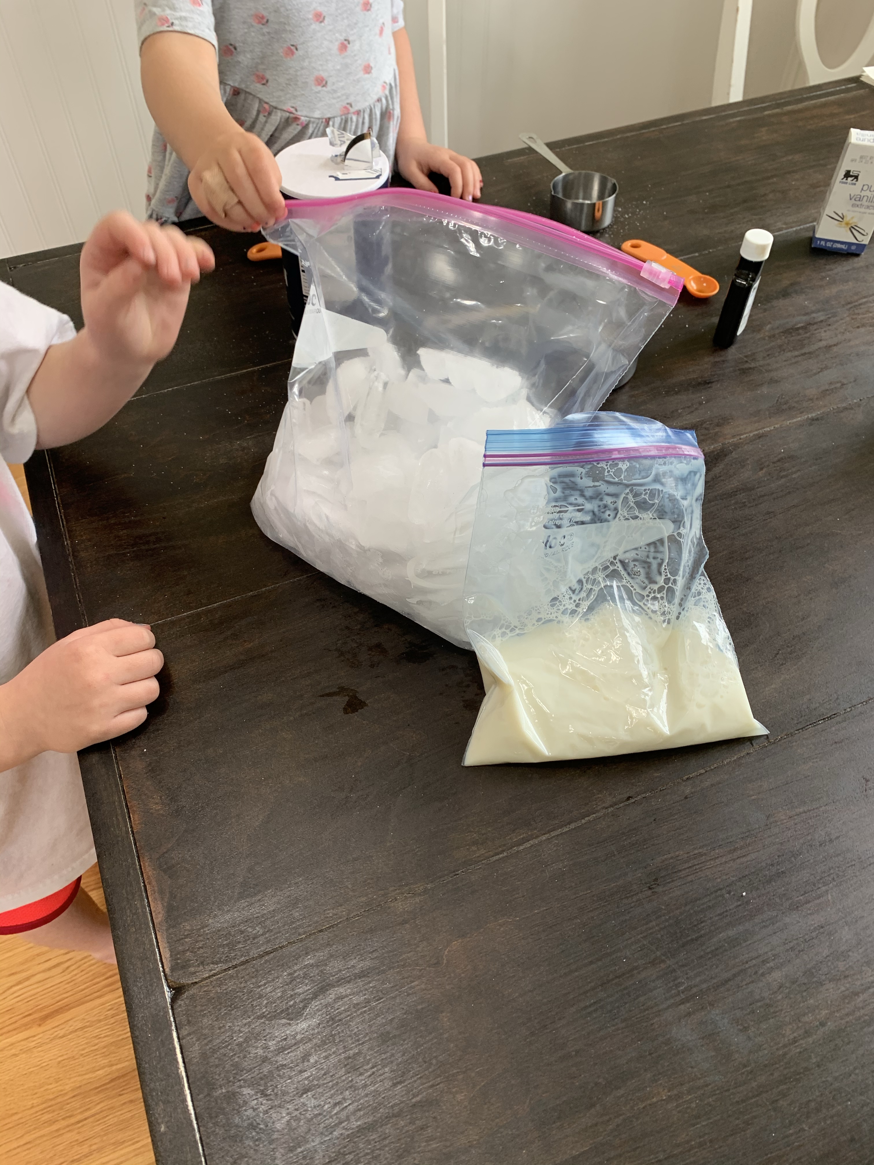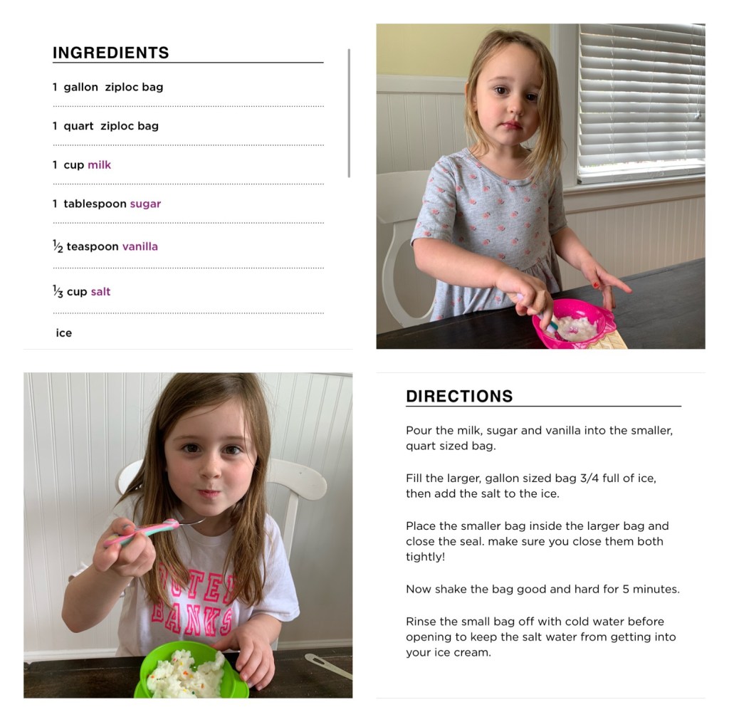 I remember making ice cream like this at school when I was a young child. I remember thinking wow that was really awesome. With Teaghan’s poem this week based around Ice Cream, I figured why not?? I first asked the girls what they thought ice cream was made out of? They both could only give me one word. Sugar 😆. I took the whole thing to be a teachable moment. We looked up a “recipe” and set out everything we needed. We talked about how those would be our ingredients. We talked about measuring cups vs. measuring spoons. We smelled vanilla. We talked. We talked about our favorite kinds of ice cream, when and where we’ve ever had it, if we prefer bowls or cones, etc. We talked about why this kind was white but chocolate flavored is brown? We talked about what they thought was going to happen when we started shaking the milk, sugar and vanilla. We laughed. We learned from mistakes. We shook so hard the Ziploc popped open and ice flew everywhere. Note to self.. double bag it. And best of all, we enjoyed a sweet treat that we made! 🍦 Try it! So fun!